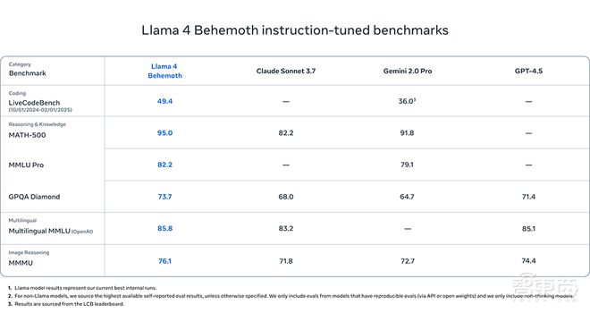 这些成绩归功于从Meta迄今最强大的模型“巨杯”Llama 4 Behemoth的提炼。Llama 4 Behemoth拥有16位专家、2880亿个活跃参数、近2万亿个总参数,在多个STEM基准测试中的表现优于GPT-4.5、Claude Sonnet 3.7和Gemini 2.0 Pro。