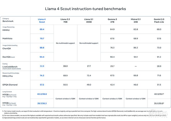 Llama 4开源空降!1000万超长上下文、单GPU可跑,还有近2万亿参数巨模型2025年4月6日报道,今日,Meta发布Llama 4系列首批模型,包括两款高效模型Llama 4 Scout、Llama 4 Maverick。这是Meta首款采用混合专家(MoE)架构构建的原生多模态模型,其中Scout更是首度支持超长10M上下文窗口。Meta还预览了其迄今最强大的新教师模型——Llama 4 Behemoth。 “小杯”Llama 4 Scout拥有16位专家、170亿个活跃参数、1090亿个总参数,被称作“同类产品中全球最好的多模态模型”,提供1000万tokens上下文窗口(对应多达500万个单词的文本),适用于单张NVIDIA H100 GPU(具有Int4量化),并在广泛基准测试中分数超过Gemma 3、Gemini 2.0 Flash-Lite、Mistral 3.1。